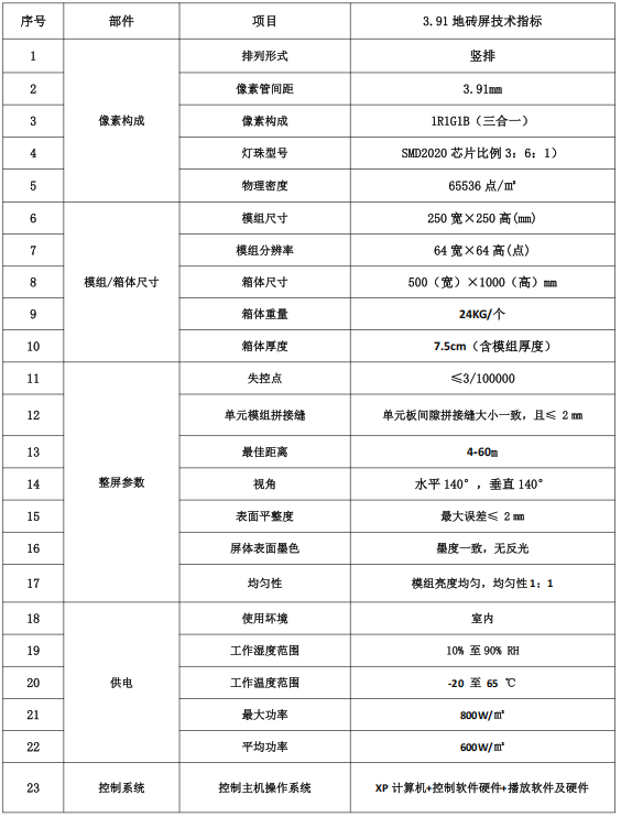 ● P3.91 地砖屏模组,发光灯珠采用 SMD2020 三合一设计,使 得 LED 地砖屏在室内还是户外使用都具有很好光效。